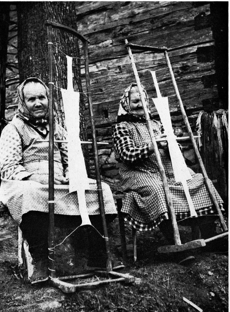 Making shaped head-dresses, Moravia, 1954. Reproduced from Collingwood, Peter. The Techniques of Sprang (1974).