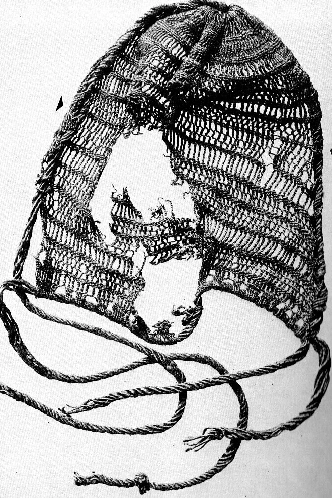 The hairnet of the woman from Borum Eshoj. Danish Bronze Age, circa 1400 BCE. Reproduced from Collingwood, Peter. The Techniques of Sprang (1974).